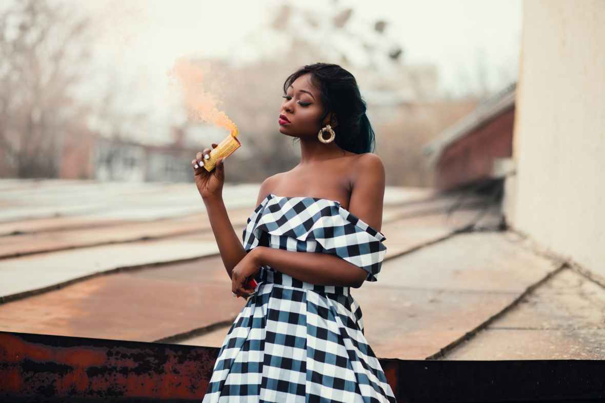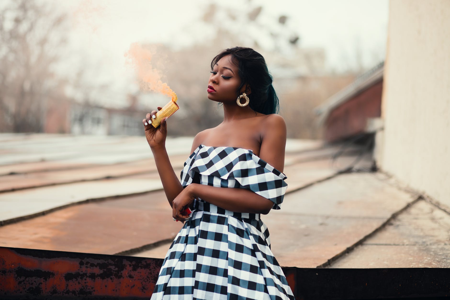 woman in black and white off shoulder dress standing near on brown wood panel September 12, 2018 • 1880 × 1253 Photo by Godisable Jacob on Pexels.com