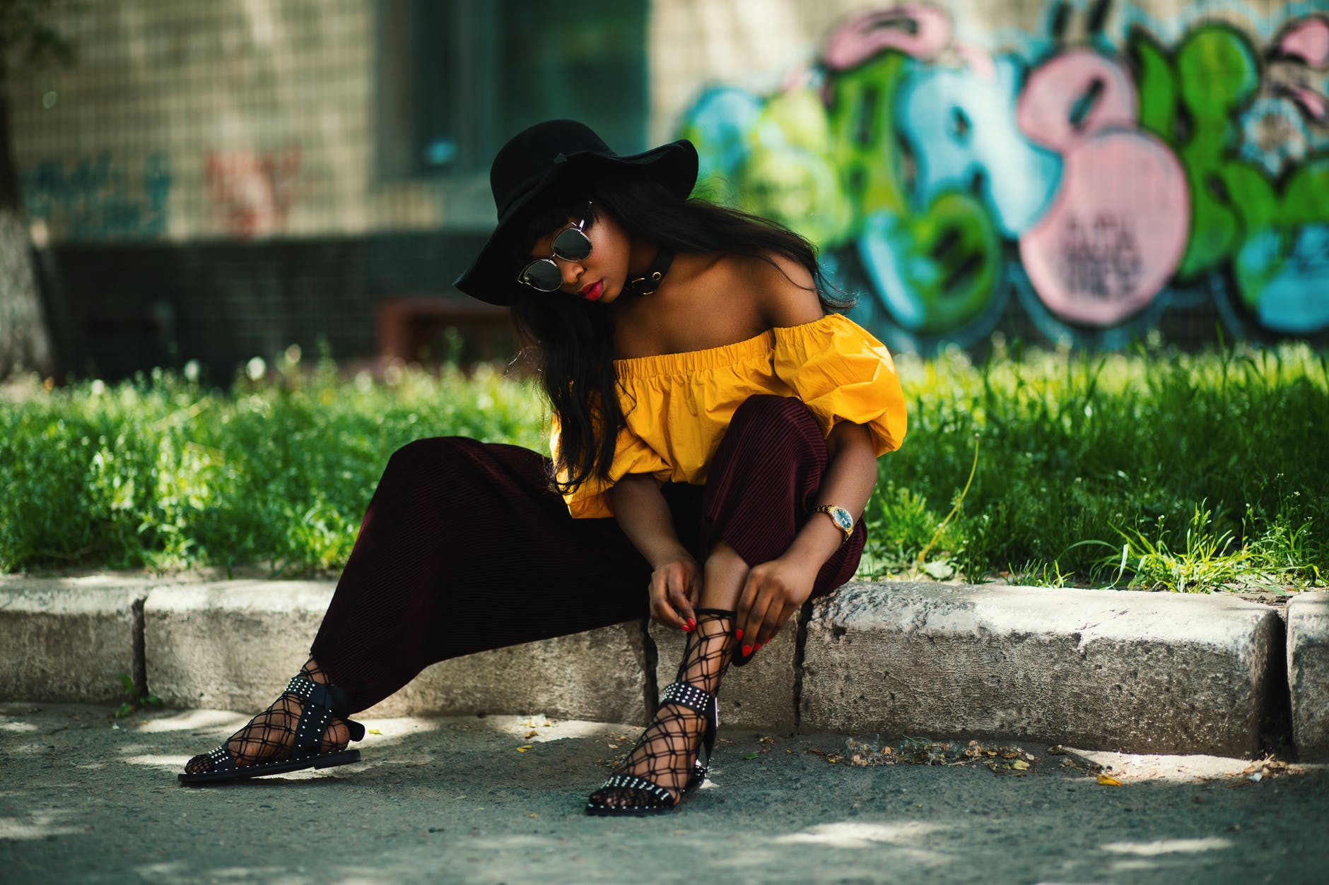 woman wearing yellow off shoulder top and black pants sitting on sidewalk fixing lace sandals October 9, 2018 • 1880 × 1253 Photo by Godisable Jacob on Pexels.com